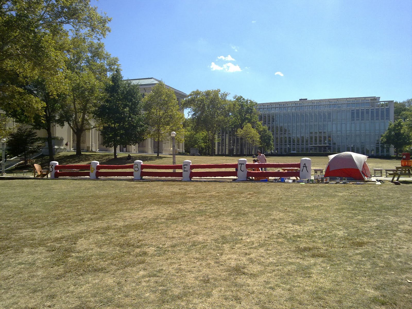Bevor ich gestern nach der Arbeit nach Haus gefahren bin, hab ich auf einer Wiese ein paar Jungs getroffen, die gerade anfangen wollten Fussball zu spielen. Also bin ich einfach hin und hab gefragt, ob ich denn mitspielen kann. „Klar“ haben die gesagt, aber als es darum ging in welche Mannschaft ich denn soll wurde ich gefragt „Was gefällt dir besser Computer oder Robotor?“. Mir war gar nicht bewusst, dass es da so einen expliziten Unterschied gibt. Aber anscheinend bin ich da auf ein Truppe gestoßen, wo Nerds gegen Geeks spielen. Naja, auf jeden Fall hab ich dann für die „Computer“-Mannschaft gespielt. Angefangen haben wir mit 4vs4. Aber sobald man auf dem Campus anfängt zu spielen kommen ständig neue Spieler hinzu, sodass wir irgendwann 8vs8 waren. Wir hatten sogar 2 Mädels die mitgespielt haben. Freiwillig. In Deutschland wäre so was nicht passiert und wenn ein Mädel sich bereiterklären würde mitzuspielen, würde es Kommentare von den männlichen Mitspielern geben. Aber gestern war es ganz normal das Mädels mitspielen. War schon sehr interessant. Aber das Spiel an sich war eher langweilig. Man sobald man den Ball abgespielt hat, war er weg. Ein wildes rumgestochere. Es waren vielleicht 3-4 Leute mit denen man hätte normal spielen können. Aber sei’s drum, es hat Spaß gemacht.